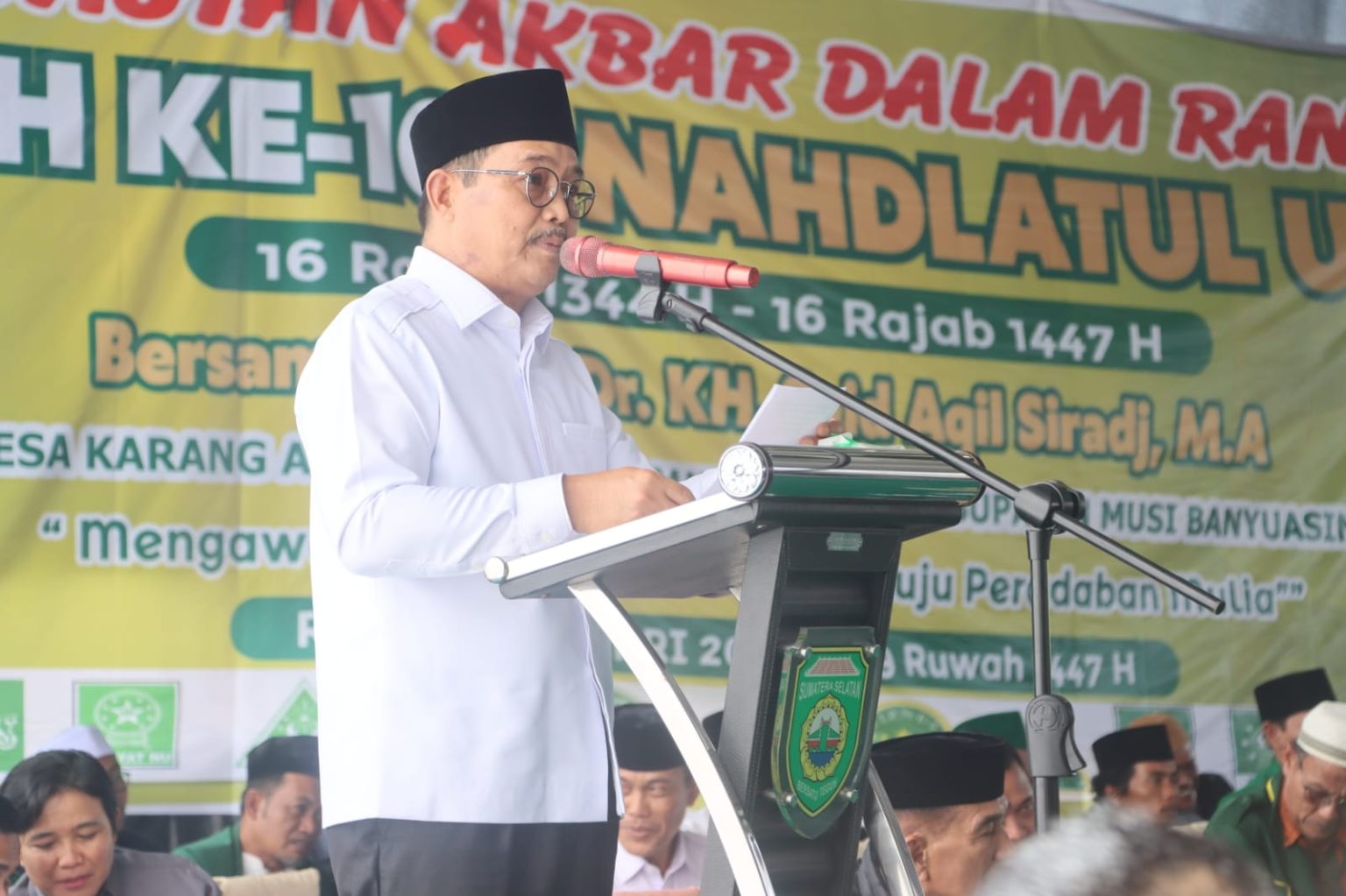 Wabup juga menegaskan bahwa kehadiran KH. Said Aqil Siroj adalah momen yang sangat dinantikan masyarakat Lalan untuk mendapatkan siraman rohani dan nasihat keulamaan dalam memperingati satu abad lebih berdirinya NU.